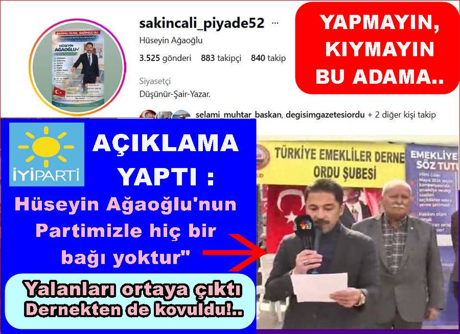 İndirimli su konusunda imza kampanyası başlatan Emekliler derneğinin standında görevli olan Hüseyin Aağaoğlu adlı kişinin gazetemiz sahibi Osman Şahin’e saldırmasının ardından karakolluk olunması ve kamuoyunda haber konusu olarak gündeme gelmesinin ardında, Hüseyin Ağaoğlu’nun tüm yalan ve yanlış bilgileri ortaya çıkarak, hem dernekten kovuldu, hemde İYİ PARTİ Ordu il başkanlığı yönetimi ile bir ilgisi ve alakasının herhangi bir bağının olmadığı ortaya çıktı.