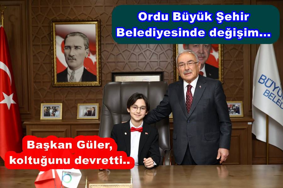 Ordu Büyükşehir Belediye Başkanı Dr. Mehmet Hilmi Güler, 23 Nisan Ulusal Egemenlik ve Çocuk Bayramı dolayısıyla makam koltuğunu Hamdullah Suphi Tanrıöver Ortaokulu 6. Sınıf öğrencisi Dağhan Öztürk’e teslim etti.