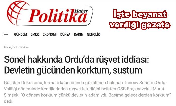 Ordu’da OSB. 2. Başkanı iş adamı Murat Şimşek,  BTV..’ye verdiği bir beyanatında Ordu Organize Sanayi Bölgesi (OSB) Başkanvekili Murat Şimşek, 2023 yılına kadar Ordu Valisi olarak görev yapan Sonel’in kendilerinden rüşvet istediğini belirtti. Şimşek, “Mahkemeye çağırsınlar, bildiğimi söylerim” açıklaması yaparak resmen rüşvet verdiğini açıklamış bulunuyor ama, bunu da ispatlaması gerekir.
