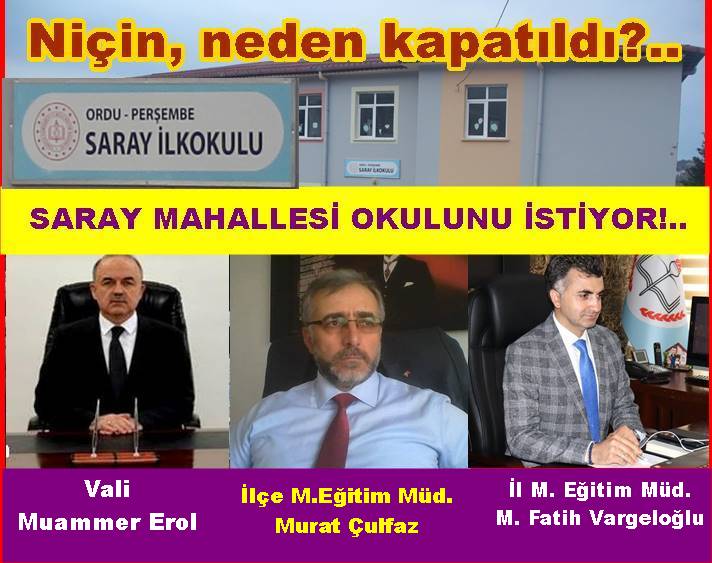 Sayın Ordu valimiz, Muammer Erol, Sayın Ordu il Milli Eğitim Müdürü Mehmet Fatih Vargeloğlu, Sayın Perşembe ilçe Mili Eğitim Müdürü Murat Çulfaz beyefendiler ve Perşembe kaymakamımız sayın Fatma Turhan Keser hanımefendiye soruyorum. Şehre yakın, her yönü ile mükemmel, çok eski tarihe dayanmış, ama yeni bir okul sıfatına sahip, hatta hiçbir eksiği bulunmayan önemli bilim adamları yetiştirmiş, rahmetli Prof. Dr. Mehmet Çavuşoğlu gibi bilim adamlarının okuma yazma öğrendiği ve babası rahmetli öğretmen Mehmet Aydın gibi öğretmenlerin bu okulda görev yaptığını da hatırlatmak istersek böyle bir okulun eğitime kapatılması, eğitim camiasına yapılmış bir ihanet benzeri yanlışlık değimlidir? Bu tarihin yaşatılması gerekirken, neden yok edilmeye çalışıldı?